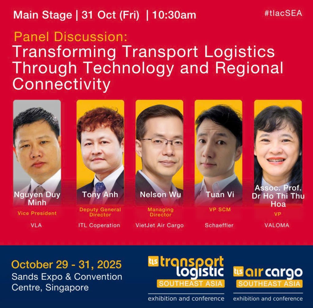 Một trong những phiên được mong đợi nhất tại tlacSEA 2025 là Panel Discussion với chủ đề “Chuyển đổi logistics vận tải thông qua công nghệ và kết nối khu vực”, diễn ra lúc 10:30 sáng ngày 31/10/2025 (Thứ Sáu) tại Main Stage, Sands Expo & Convention Centre, Singapore.
