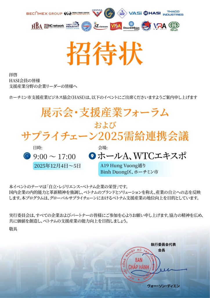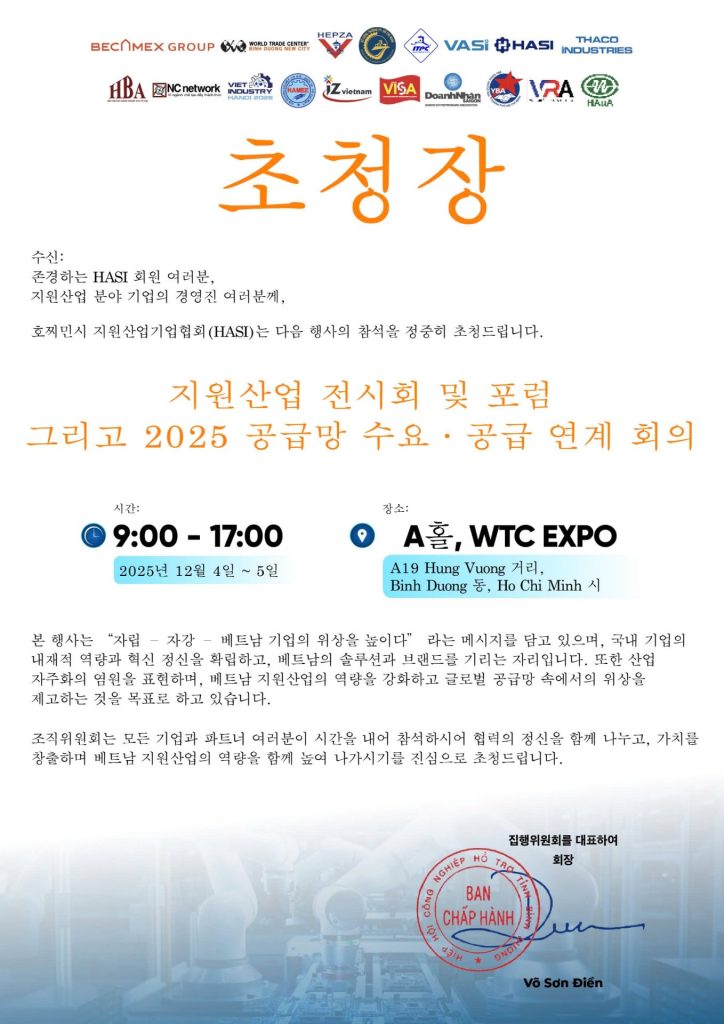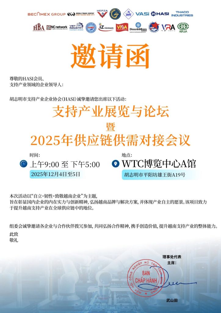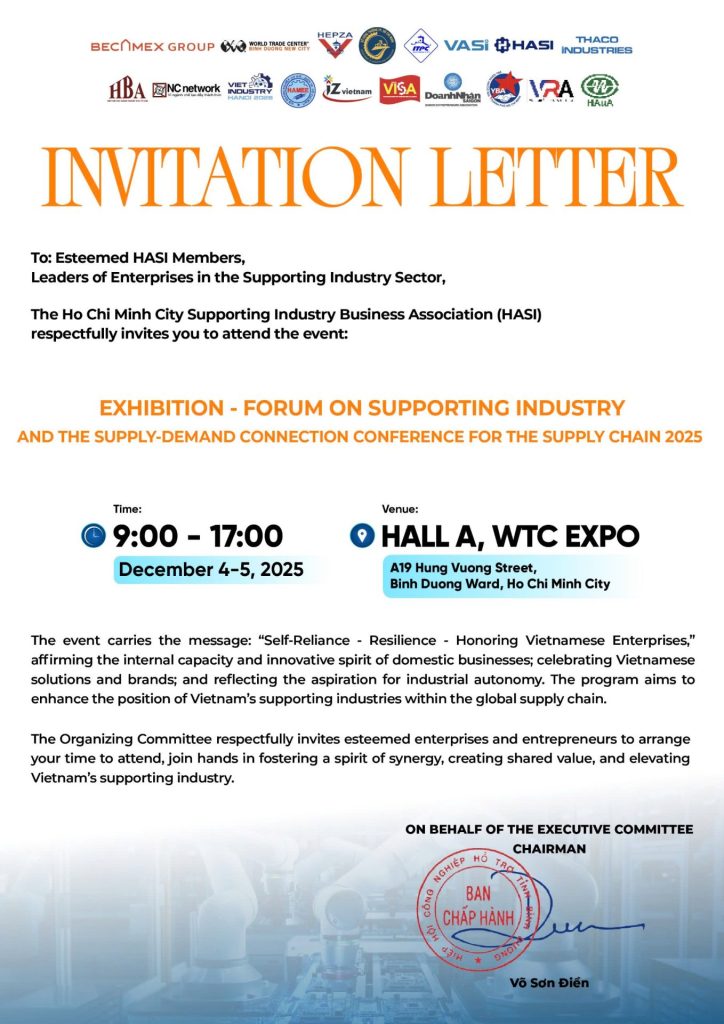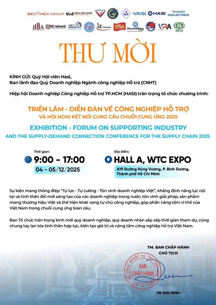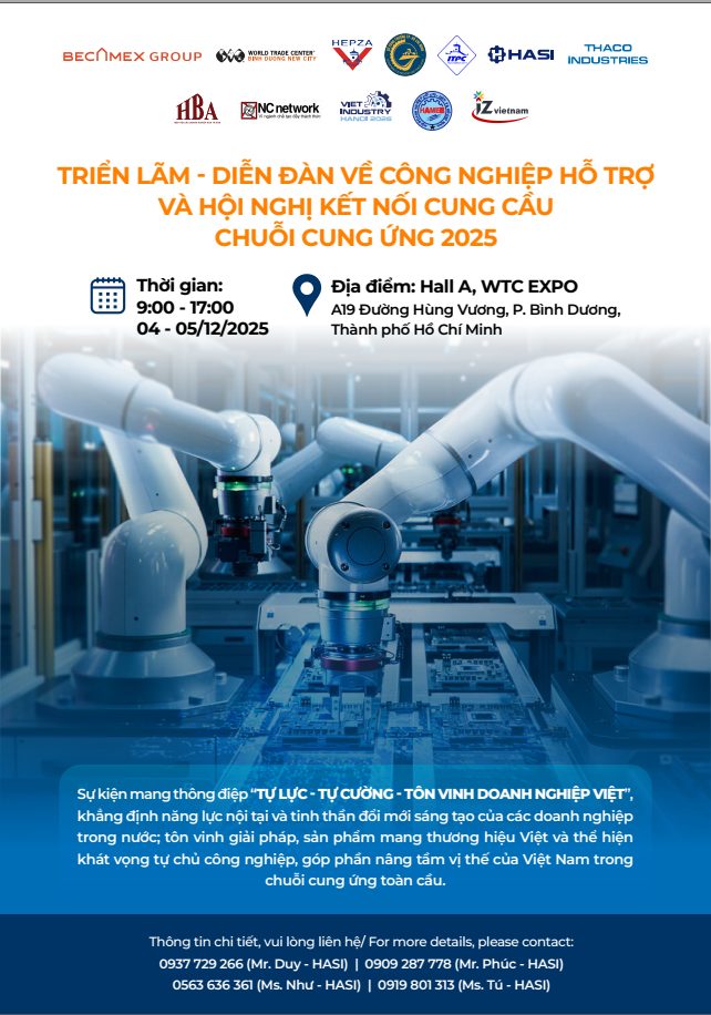 Trong bối cảnh công nghiệp Việt Nam chuyển mình theo hướng xanh – thông minh – bền vững, Hiệp hội Công nghiệp Hỗ trợ TP.HCM (HASI) phối hợp cùng Becamex Group, WTC Bình Dương, HEPZA, ITPC và Thaco Industries tổ chức sự kiện quy mô lớn nhất năm của ngành Công nghiệp Hỗ trợ.